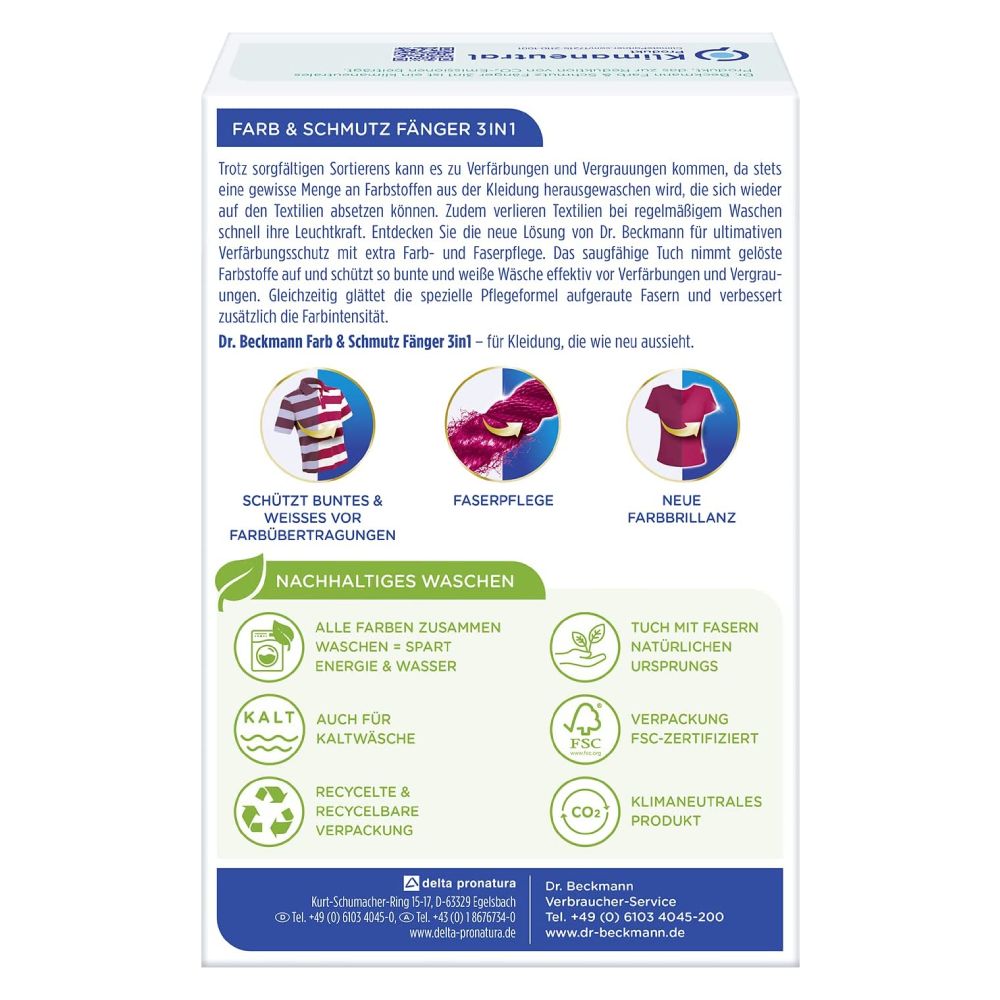 Krāsu un netīrumu savākšanas lupatiņas 48 gab. Notver krāsas un netīrumu daļiņas veļas sārmā un novērš nogulumu veidošanos uz drēbēm. Palīdz saglabāt Jūsu apģērba krāsu spilgtumu. Lietošana: Ievietojiet veļu mazgājamā mašīnā kā parasti. Pievienojiet mazgāšanas līdzekli (veļas mazgāšanas kapsulas jāievieto pirms veļas). Ievietojiet lupatiņas mazgājamā mašīnā un palaidiet vajadzīgo mazgāšanas programmu. Dozēšana: baltā veļa: 1-2 lupatiņas. Krāsaina veļa: 2-3 lupatiņas. Svarīgi: vienmēr sekojiet apģērba kopšanas etiķešu norādījumus. Jaunās krasainās drēbes pirmās vairākas reizes mazgājiet atsevišķi. UZMANĪBU! Sargāt no bērniem. Derīgs 5 gadus no ražošanas datuma (skatīt uz iepakojuma). Ražotājs: Delta Pronatura, Vācija. Izplatītājs: Moop Sia, Dzirnavu 45, Rīga, Latvija
