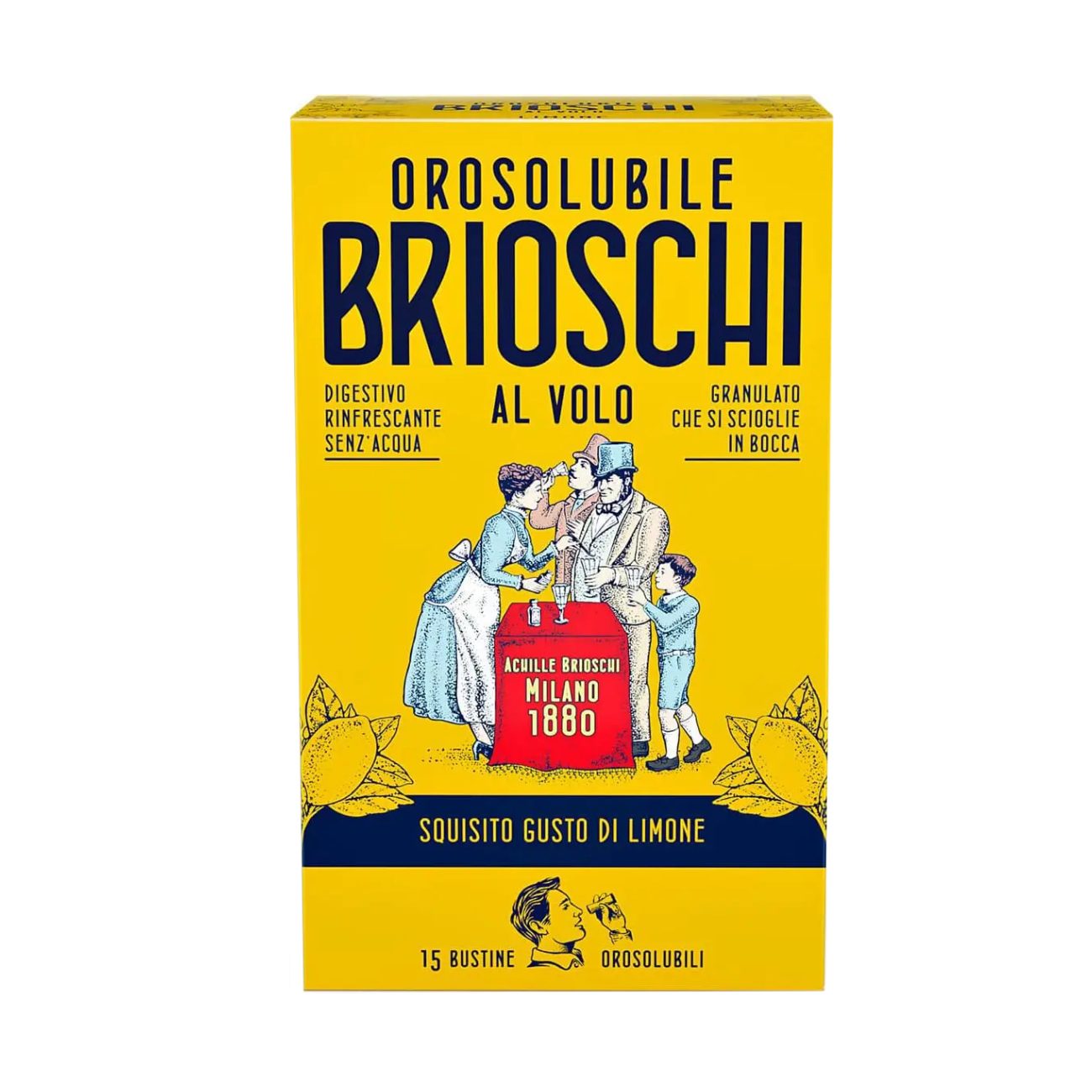 BRIOSCHI mutes dobumā šķīstošs gremošanas līdzeklis 15 gab. Citronu garša. Ideāli pēc ēdienreizēm. Lietot bez ūdens. Sastāvdaļas: Cukurs; skābuma regulētāji: ābolskābe; nātrija bikarbonāts; dabīgs aromatizētājs: ingvera saknes ekstrakts 0,01%. Uzturvērtība uz 100g: enerģētiskā vertība 0 kJ / 342,62 kcal; tauki 0g, no kuriem piesātinatās taukskābes 0g; ogļhidrāti 79,49g, no kuriem cukurs 79,12g; olbaltumvielas 0g; sāls 6,84g. Ieteicams līdz: skatīt uz iepakojuma. Uzglabāt sausā un vēsā vietā. Ražotājs: Società Italo-Britannica L. Manetti – H. Roberts & C.p.A. Itālija. Pārdevējs: Moop Sia, Dzirnavu 45, Rīga, Latvija